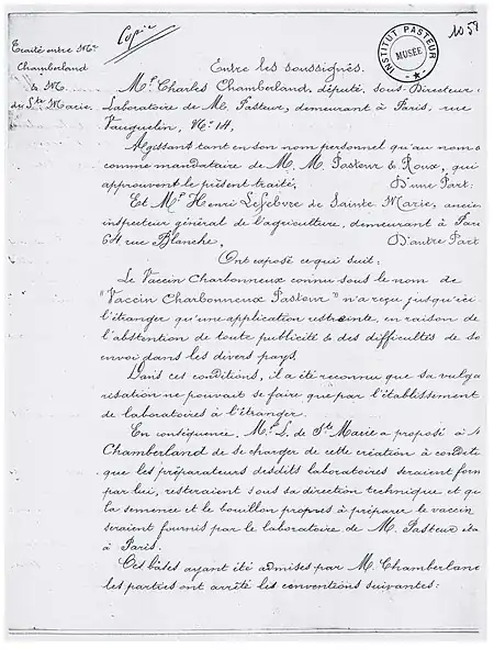 Contract for production of anthrax vaccine in foreign countries signed in 1886 between Charles Chamberland(Chamberland represented Pasteur, Roux, and himself) and Henri Lefebvre de Sainte Marie[33]