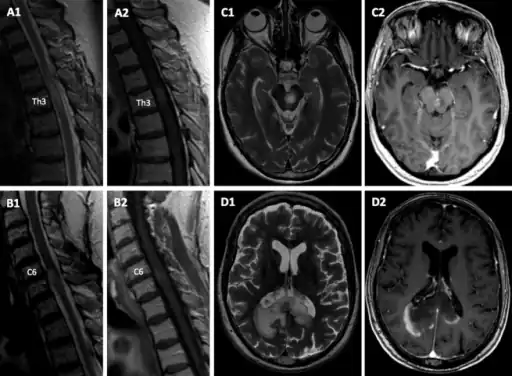 - ↑ Pérez CA, Garcia-Tarodo S, Troxell R. MRI-Negative Myelitis Associated With Myelin Oligodendrocyte Glycoprotein Antibody Spectrum Demyelinating Disease. Child Neurol Open. 2019;6:2329048X19830475. Published 2019 Feb 17. https://doi.org/10.1177/2329048X19830475 Archived 2022-05-14 at the Wayback Machine
