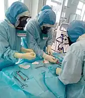 The effectiveness of surgical masks in limiting particle transmission is a function of material and fit.[44] Since the start of the pandemic, scientists have evaluated various modifications to ear loop surgical masks aimed at improving mask efficacy by reducing or eliminating gaps between the mask and face.[45] The CDC evaluated and recommends two such modifications to ear loop masks to minimize the transmission of SARS-CoV-2. Under regular use, the CDC found that a surgical mask worn by a coughing individual blocked 41.3% of simulated cough aerosols (0.1–7.0 μm particle size) from reaching a second individual six feet away. However, by applying a knot and tuck technique,[lower-alpha 1] 62.9% of particles were blocked. When the surgical mask was covered with a larger cloth mask, 82% of particles were blocked. When both the source and recipient wore masks, 84% of particles were blocked. The number increased to more than 95% when both parties either wore double masks (surgical mask with larger cloth mask) or used the knot and tuck technique.[46]