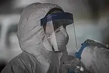 Elastomeric respirators are reusable personal protective equipment comprising a tight-fitting half-facepiece or full-facepiece respirator with exchangeable filters such as cartridge filters.[61] They provide an alternative respiratory protection option to filtering facepiece respirators such as N95 masks. Some healthcare workers have used them during times of short supply caused by the pandemic, as they can be reused over an extended period in healthcare settings.[61][62] However, most elastomeric respirators have an unfiltered exhalation vent which would allow the virus to spread from the wearer.[62]