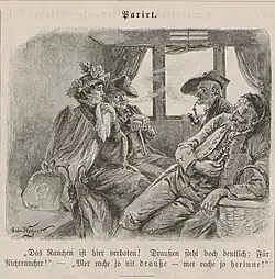Nichtraucherschutz (the protection of non-smokers [from passive smoking]) was the principle behind some bans.[35] In 1941, tobacco smoking in trams was outlawed in sixty German cities.[60] In 1944, smoking in buses and city trains was made illegal, on the personal initiative of Hitler, who feared female ticket collectors might be the victims of passive smoking.[1]