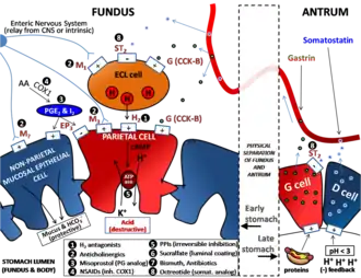 PPI irreversibly inhibits H+/K+ ATPase proton pump on gastric parietal cells to create a profound, long-lasting antisecretory effect on gastric acid.[61][64]