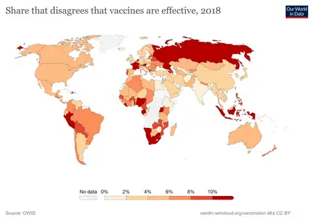 In July 2018, two 12-month-old children died in Samoa after receiving incorrectly prepared MMR vaccinations.[147] These two deaths were picked up by anti-vaccine groups and used to incite fear towards vaccination on social media, causing the government to suspend its measles vaccination programme for ten months, despite advice from the WHO.[148][149] The incident caused many Samoan residents to lose trust in the healthcare system.[150] UNICEF and the World Health Organization estimate that the measles vaccination rate in Samoa fell from 74% in 2017 to 34% in 2018,[151][152] similar to some of the poorest countries in Africa.[153]