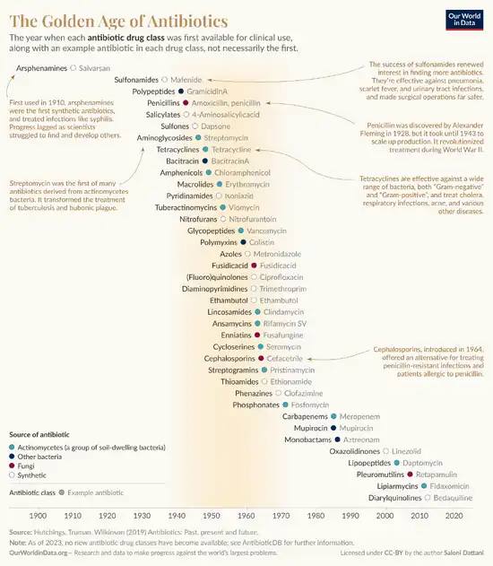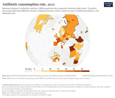 100. Dattani, Saloni; Spooner, Fiona; Ritchie, Hannah; Roser, Max (23 December 2024). "Antibiotics and Antibiotic Resistance". Our World in Data.