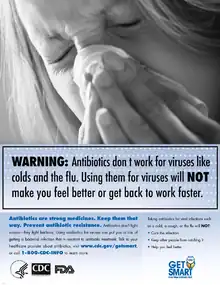 This poster from the U.S. Centers for Disease Control and Prevention "Get Smart" campaign, intended for use in doctors' offices and other healthcare facilities, warns that antibiotics do not work for viral illnesses such as the common cold.