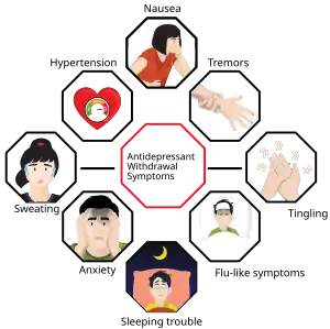Antidepressant discontinuation syndrome, also called antidepressant withdrawal syndrome, is a condition that can occur following the interruption, reduction, or discontinuation of antidepressant medication that was taken continuously for at least one month.[5] The symptoms may include flu-like symptoms, trouble sleeping, nausea, poor balance, sensory changes, and anxiety.[2][3][4] The problem usually begins within three days and may last for several months.[2][4] Rarely psychosis may occur.[2]