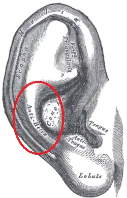 The antihelix divides above into two legs or crura; the crura antihelicis, between which is a triangular depression, the fossa triangularis.
