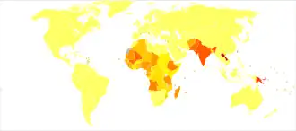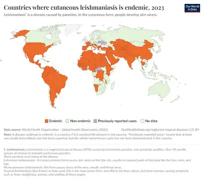 Out of 200 countries and territories reporting to WHO, 97 countries and territories are endemic for leishmaniasis.[33] The settings in which leishmaniasis is found range from rainforests in Central and South America to deserts in western Asia and the Middle East. It affects as many as 12 million people worldwide, with 1.5–2.0 million new cases each year.[34] The visceral form of leishmaniasis has an estimated incidence of 500,000 new cases.[35] In 2014, more than 90% of new cases reported to WHO occurred in six countries: Brazil, Ethiopia, India, Somalia, South Sudan and Sudan.[36] As of 2010, it caused about 52,000 deaths, down from 87,000 in 1990.[10] Different types of the disease occur in different regions of the world.[2] Cutaneous disease is most common in Afghanistan, Algeria, Brazil, Colombia, and Iran, while mucocutaneous disease is most common in Bolivia, Brazil, and Peru, and visceral disease is most common in Bangladesh, Brazil, Ethiopia, India, and Sudan.[2]