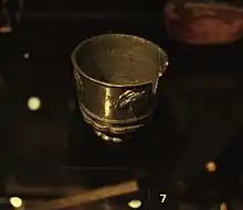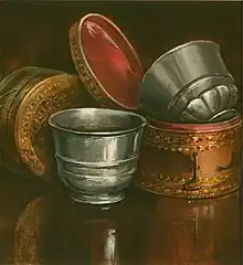 Roman banquets of antiquity had goblets of specially prepared antimony-doctored wine. The antimonial cup would be employed in order to facilitate repeated doses of overeating by a followup of purging.[3] The resurrection of the antimonial cup may have occurred because of the prohibition of antimony in 1566 by an Act of Parliament. As a method to circumvent the law, metal tin cups were made with antimony as one of its ingredients.[4] When wine was allowed to stand in one for approximately 24 hours the wine became impregnated with tartrate of antimony, from the action of the tartar contained in the wine upon the metal of the film of oxide formed upon its surface.[5] This resulting alcoholic drink was attractive to sick patients as a medicine by purging the body. The family antimonial cup gathered increased powers of suggestion with years of being handed down from generation to generation.[6] Antimonial cups were used in England and America from earlier part of the 17th century and well into the 18th century. The spelling at the time was "Antimonyall Cupps." The cups were common in monasteries.[6]