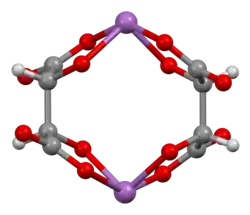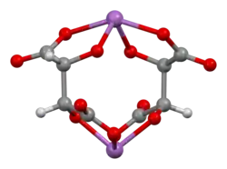 Antimony potassium tartrate has been the subject of several X-ray crystallography studies.[24][25][26][27][28][2] The core complex is an anionic dimer of antimony tartrate (Sb2(C4H2O6)22-) which is arranged in a large ring with the carbonyl groups pointing outwards. The complex has D2 molecular symmetry with two Sb(III) centers bonded in distorted square pyramids. Water and potassium ions are held within the unit cell but are not tightly bound to the dimer. The anion is a well-used resolving agent.[29]