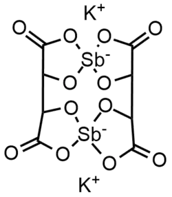 Antimony potassium tartrate, also known as potassium antimonyl tartrate, potassium antimontarterate, or tartar emetic,[3] has the formula K2Sb2(C4H2O6)2. The compound has long been known as a powerful emetic, and was used in the treatment of schistosomiasis and leishmaniasis. It is used as a resolving agent. It typically is obtained as a hydrate.