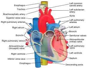 The word aorta stems from the Late Latin aorta from Classical Greek aortē (ἀορτή), from aeirō, "I lift, raise" (ἀείρω)[25] This term was first applied by Aristotle when describing the aorta and describes accurately how it seems to be "suspended" above the heart.[26]
