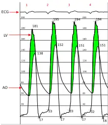 As a consequence of this stenosis, the left ventricle must generate a higher pressure with each contraction to effectively move blood forward into the aorta.[5][20] Initially, the LV generates this increased pressure by thickening its muscular walls (myocardial hypertrophy). The type of hypertrophy most commonly seen in AS is known as concentric hypertrophy,[5] in which the walls of the LV are (approximately) equally thickened.