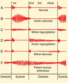 Aortic stenosis is most often diagnosed when it is asymptomatic and can sometimes be detected during routine examination of the heart and circulatory system. Good evidence exists to demonstrate that certain characteristics of the peripheral pulse can rule in the diagnosis.[24] In particular, there may be a slow and/or sustained upstroke of the arterial pulse, and the pulse may be of low volume. This is sometimes referred to as pulsus parvus et tardus.[10][18] There may also be a noticeable delay between the first heart sound (on auscultation) and the corresponding pulse in the carotid artery (so-called 'apical-carotid delay'). In a similar manner, there may be a delay between the appearance of each pulse in the brachial artery (in the arm) and the radial artery (in the wrist).