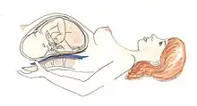 | A watercolor drawing of a pregnant woman lying flat on her back, causing the aorta and inferior vena cava to compress and reduce circulation. | |