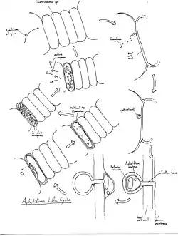 All known examples of Aphelidium are obligate parasites of freshwater phytoplankton.[4][6] As parasites, the life cycle of Aphelidium is closely tied to its ecological relationship with its hosts. The cycle begins with the motile Aphelidium zoospore contacting its host, a green alga.[4] The singular flagellum of the zoospore is lost as part of the attachment process.[4] A pseudopodium extends from the zoospore and probes the host surface, seeking a weakness or gap in the cell wall.[7] The attached zoospore first encysts then inserts an infection tube into the host cell, priming the ingress of the Aphelidium.[4] The cyst forms a posterior vacuole, which expands and raises the internal pressure of the cyst.[4] Ultimately the pressure pushing against the chitin wall of the cyst punctures the cell wall of the host green alga at the point of insertion of the infection tube, and the Aphelidium enters its host abruptly, leaving the cyst cell wall behind.[4]