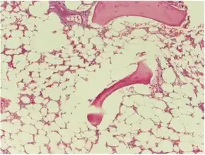 Micrograph of bone marrow taken from a person with aplastic anemia. The bone marrow is mostly fat cells with few blood forming cells.[2]