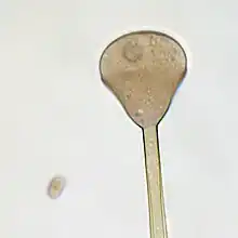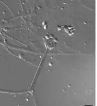 Unlike most members of the Mucorales, Apophysomyces species often fail to sporulate under standard clinical laboratory culture conditions. These fungi require Czapek's agar (CZA), a nutrient-defined medium.[2] Colonies grow rapidly at 37 °C on CZA and initially appear white and woolly becoming greyish brown with age.[4][6][7] Colonies are grey and floccose, will grow on the lid of the petri dish, and are colourless on reverse.[8] Sporangiosphores are unbranched, smooth-walled, and light brown.[4] Sporangia are apophyseal, pyriform, beginning as whitish and turning brown with maturity. Sporangiospores are variable in size and shape.[6] Sexuality has not been observed in A. variabilis.[8]