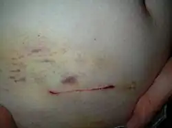 Recovery time from the operation varies from person to person. Some take up to three weeks before being completely active; for others, it can be a matter of days. In the case of a laparoscopic operation, the patient has three stapled scars of about an inch (2.5 cm) in length, between the navel and pubic hair line. When an open appendectomy has been performed, the patient has a 2- to 3-inch (5–7.5 cm) scar, which will initially be heavily bruised.[20]