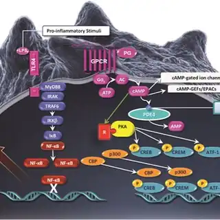 Apremilast is a small-molecule inhibitor of PDE4,[10] an enzyme that breaks down cyclic adenosine monophosphate (cAMP).[10] In inflammatory cells, PDE4 is the dominant enzyme responsible for this reaction. The resulting increase in cAMP levels down-regulates expression of a number of pro-inflammatory factors such as tumor necrosis factor alpha (TNFα), interleukin 17, interleukin 23, and many others, and up-regulates the anti-inflammatory interleukin 10. In ex vivo models of arthritis, IL-12/IL-23p40 was specifically identified as a downstream target of apremilast.[17] The importance of these individual factors for the clinical effect of apremilast is not clear.[6]