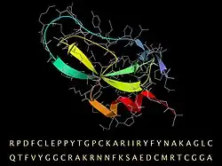 Aprotinin is a monomeric (single-chain) globular polypeptide derived from bovine lung tissue. It has a molecular weight of 6512 Da and consists of 16 different amino acid types arranged in a chain 58 residues long[4][5] that folds into a stable, compact tertiary structure of the 'small SS-rich" type, containing 3 disulfides, a twisted β-hairpin and a C-terminal α-helix.[6]