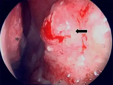 Nasal fish tank granuloma- Anterior rhinoscopy revealed a granulomatous lesion with active oozing arrow