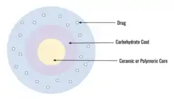 After synthesizing and purifying the core, the carbohydrate layer is added to its surface. Common coating materials are typically polyhydroxy oligomers such as cellobiose, citrate, lactose, and sucrose.[2] This layer seems to be important for the properties of aquasomes, as it influences several drug characteristics including adsorption, molecular stability, and conformation (shape), and acts as a dehydroprotectant.[1] The addition of the carbohydrate layer to the surface of the nanocrystalline core is commonly carried out by passive adsorption through incubation and sonication. Similar to the processing of the core, the carbohydrate layer is subjected to centrifugation, washing, and further sonification followed by heated air drying.[1]