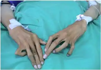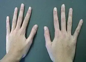 Arachnodactyly ("spider fingers") is a medical condition that is characterized by fingers and toes that are abnormally long and slender, in comparison to the palm of the hand and arch of the foot. In some cases, the thumbs of an individual with the condition are pulled inwards towards the palm.[1] This condition is present at birth.