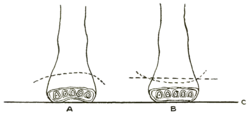 At the posterior part of the metatarsus and the anterior part of the tarsus the arches are complete, but in the middle of the tarsus they present more the characters of half-domes, the concavities of which are directed downward and medialward, so that when the medial borders of the feet are placed in apposition a complete tarsal dome is formed. The transverse arch is composed of the three cuneiforms, the cuboid, and the five metatarsal bases. The transverse arch is strengthened by the interosseous, plantar, and dorsal ligaments, by the short muscles of the first and fifth toes (especially the transverse head of the adductor hallucis), and by the fibularis longus, whose tendon stretches across between the piers of the arches.[1]