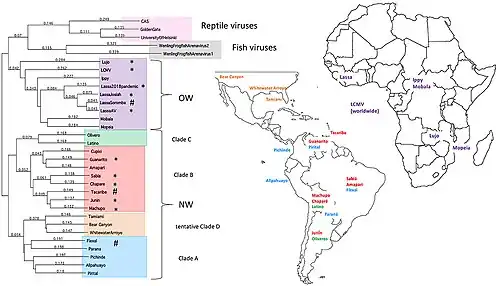 Mammarenaviruses can be divided into two serogroups, which differ genetically and by geographical distribution:[37] When the virus is classified "Old World" this means it was found in the Eastern Hemisphere in places such as Europe, Asia, and Africa. When it is found in the Western Hemisphere, in places such as Argentina, Bolivia, Venezuela, Brazil, and the United States, it is classified "New World". Lymphocytic choriomeningitis (LCM) virus is the only mammarenavirus found worldwide because of its ubiquitous Old World host, the house mouse. Old and New World area viruses appear to have diverged ~45,000 years ago.[38] The Old World Mammarenaviruses originated ~23.1-1.88 thousand years ago, most likely in Southern Africa, while the New World Mammarenaviruses evolved in the Latin America-Caribbean region ~41.4-3.3 thousand years ago.