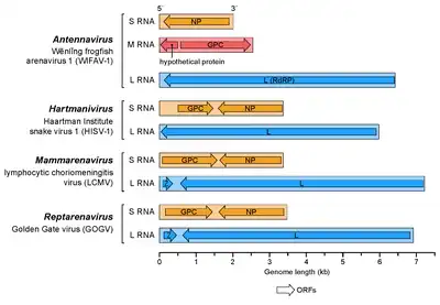 The S-segment RNA is approximately 3.5 kb, and encodes the viral nucleocapsid protein (NP) and glycoprotein (GPC).[24] The L-segment RNA is approximately 7.2 kb, and encodes the viral RNA-dependent RNA-polymerase (L) and a small RING-domain containing protein (Z).[25][26][27]