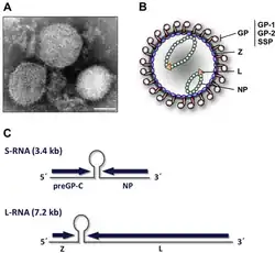(A) Electron micrograph of Lassa virus, bar = 100nm (B) diagram and (C) genome of arenavirus