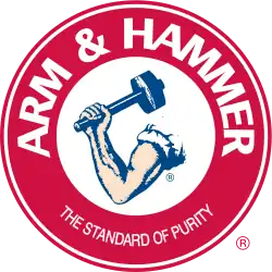 Arm & Hammer is a brand of baking soda-based consumer products marketed by Church & Dwight, a major American manufacturer of household products. The logo of the brand depicts the ancient symbol of a muscular arm holding a hammer inside a red circle with the brand name and slogan. Originally associated solely with baking soda and washing soda, the company began to expand the brand to other products in the late 1970s by using baking soda as a deodorizing ingredient. The new products included toothpaste, laundry detergent, underarm deodorant, and cat litter.