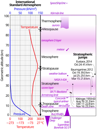 The Armstrong limit or Armstrong's line is a measure of altitude above which atmospheric pressure is sufficiently low that water boils at the normal temperature of the human body. Exposure to pressure below this limit results in a rapid loss of consciousness, followed by a series of changes to cardiovascular and neurological functions, and eventually death, unless pressure is restored within 60–90 seconds.[1] Because of this, airplanes usually fly below the Armstrong limit. On Earth, the limit is around 18–19 km (11–12 mi; 59,000–62,000 ft) above sea level,[1][2] above which atmospheric air pressure drops below 0.0618 atm (6.3 kPa, 47 mmHg, or about 1 psi). The U.S. Standard Atmospheric model sets the Armstrong limit at an altitude of 63,000 feet (19,202 m). The Armstrong limit is often used as the lower limit of near-space.