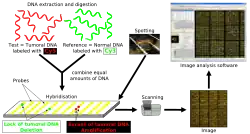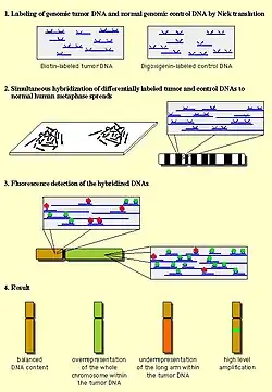 Comparative genomic hybridization (CGH) is a molecular cytogenetic method for analysing copy number variations (CNVs) relative to ploidy level in the DNA of a test sample compared to a reference sample, without the need for culturing cells. The aim of this technique is to quickly and efficiently compare two genomic DNA samples arising from two sources, which are most often closely related, because it is suspected that they contain differences in terms of either gains or losses of either whole chromosomes or subchromosomal regions (a portion of a whole chromosome). This technique was originally developed for the evaluation of the differences between the chromosomal complements of solid tumor and normal tissue,[1] and has an improved resolution of 5–10 megabases compared to the more traditional cytogenetic analysis techniques of giemsa banding and fluorescence in situ hybridization (FISH) which are limited by the resolution of the microscope utilized.[2][3]