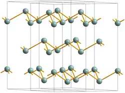 The three most common arsenic allotropes are grey, yellow, and black arsenic, with grey being the most common.[21] Grey arsenic (α-As, space group R3m No. 166) adopts a double-layered structure consisting of many interlocked, ruffled, six-membered rings. Because of weak bonding between the layers, grey arsenic is brittle and has a relatively low Mohs hardness of 3.5. Nearest and next-nearest neighbors form a distorted octahedral complex, with the three atoms in the same double-layer being slightly closer than the three atoms in the next.[22] This relatively close packing leads to a high density of 5.73 g/cm3.[23] Grey arsenic is a semimetal, but becomes a semiconductor with a bandgap of 1.2–1.4 eV if amorphized.[24] Grey arsenic is also the most stable form. Yellow arsenic is soft and waxy, and somewhat similar to tetraphosphorus (P4).[25] Both have four atoms arranged in a tetrahedral structure in which each atom is bound to each of the other three atoms by a single bond. This unstable allotrope, being molecular, is the most volatile, least dense, and most toxic. Solid yellow arsenic is produced by rapid cooling of arsenic vapor, As4. It is rapidly transformed into grey arsenic by light. The yellow form has a density of 1.97 g/cm3.[23] Black arsenic is similar in structure to black phosphorus.[23] Black arsenic can also be formed by cooling vapor at around 100–220 °C and by crystallization of amorphous arsenic in the presence of mercury vapors.[26] It is glassy and brittle. Black arsenic is also a poor electrical conductor.[27]