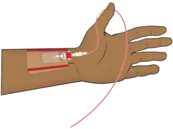 An arterial line is usually inserted into the radial artery in the wrist, but can also be inserted into the brachial artery at the elbow, into the femoral artery in the groin, into the dorsalis pedis artery in the foot, or into the ulnar artery in the wrist.[2] A golden rule is that there has to be collateral circulation to the area affected by the chosen artery, so that peripheral circulation is maintained by another artery even if circulation is disturbed in the cannulated artery.[3]