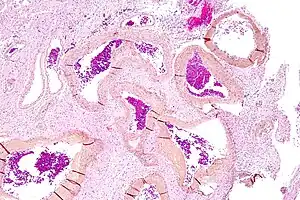 Micrograph of an arteriovenous malformation in the brain. HPS stain.