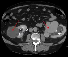Arteriovenous malformation is an abnormal connection between an artery and vein, without intervening capillaries.[2] Often no symptoms are present, though sometimes pain, seizures, or stroke symptoms may occur.[1] Complications may include bleeding (~4% of cases), steal syndrome, or heart failure.[2][1]