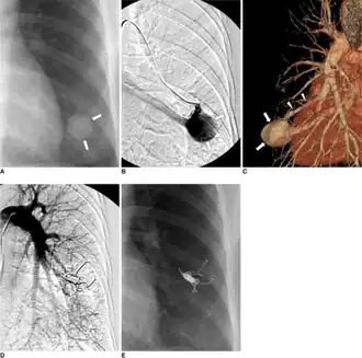 10. 10.0 10.1 Tellapuri, S; Park, HS; Kalva, SP (August 2019). "Pulmonary arteriovenous malformations". The international journal of cardiovascular imaging. 35 (8): 1421–1428. doi:10.1007/s10554-018-1479-x. PMID 30386957.