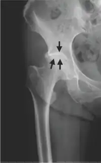 | Radiograph taken at onset of severe right hipjoint pain showing KL grading I hip OA | |