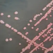 The pink colouration of the bacterium is caused by the C50 carotenoid bacterioruberin and a number of its mono-, di- and tetraglycosylated derivatives.[1]