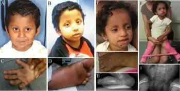 | A–D: Person AB. Aged (A) 3 years and (B) 5 years. Hyperkeratosis and lichenification of palm of right hand (C) and sole of left foot (D). E–I: Person CD. Facies aged 3 (E); in plaster after corrective hip surgery (F). Hyperkeratosis, dorsum of right foot (G). Radiographs of right foot showing vertical talus (H) and of pelvis showing hip dislocation (I). | |