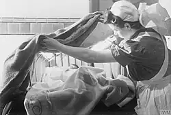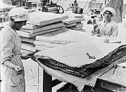 As a result of Cooke's paper, Parliament commissioned an inquiry into the effects of asbestos dust by E. R. A. Merewether, Medical Inspector of Factories, and C. W. Price, a factory inspector and pioneer of dust monitoring and control.[58] Their subsequent report, Occurrence of Pulmonary Fibrosis & Other Pulmonary Affections in Asbestos Workers, was presented to Parliament on 24 March 1930.[59] It concluded that the development of asbestosis was irrefutably linked to the prolonged inhalation of asbestos dust, and included the first health study of asbestos workers, which found that 66% of those employed for 20 years or more suffered from asbestosis.[58] The report led to the publication of the first asbestos industry regulations in 1931, which came into effect on 1 March 1932.[60] These rules regulated ventilation and made asbestosis an excusable work-related disease.[61] The term mesothelioma was first used in medical literature in 1931; its association with asbestos was first noted sometime in the 1940s. Similar legislation followed in the US about ten years later.
