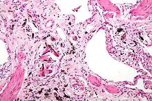- ↑ Craighead JE, Abraham JL, Churg A, et al. (October 1982). "The pathology of asbestos-associated diseases of the lungs and pleural cavities: diagnostic criteria and proposed grading schema. Report of the Pneumoconiosis Committee of the College of American Pathologists and the National Institute for Occupational Safety and Health". Arch. Pathol. Lab. Med. 106 (11): 544–96. PMID 6897166.