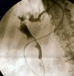 In cases where a person is too ill to tolerate endoscopy or when a retrograde endoscopic approach fails to access the obstruction, a percutaneous transhepatic cholangiogram (PTC) may be performed to evaluate the biliary system for placement of a percutaneous biliary drain (PBD).[26][13] This is often necessary in the case of a proximal stricture or a bilioenteric anastomosis (a surgical connection between the bile duct and small bowel, such as the duodenum or jejunum).[10] Once access across the stricture is obtained, balloon dilation can be performed and stones can be swept forward into the duodenum.[26] Due to potential complications of percutaneous biliary drain placement and the necessity of regular drain maintenance,[10] a retrograde approach via ERCP remains first-line therapy.[7]