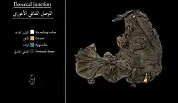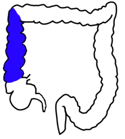 ![]() Drawing of colon seen from front (ascending colon coloured blue) | |