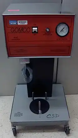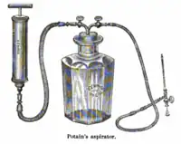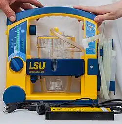 A medical aspirator is a suction machine used to remove mucus, blood, and other bodily fluids from a patient. They can be used during surgical procedures but an operating theater is generally equipped with a central system of vacuum tubes.[1] Most aspirators are therefore portable, for use in ambulances and nursing homes, and can run on AC or battery power. They consist of a vacuum pump, a vacuum regulator and gauge, a collection canister, and sometimes a bacterial filter. Plastic tubing is used to continuously draw fluid into the collection canister.