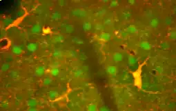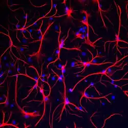 - ↑ Liddelow SA, Guttenplan KA, Clarke LE, Bennett FC, Bohlen CJ, Schirmer L, et al. (January 2017). "Neurotoxic reactive astrocytes are induced by activated microglia". Nature. 541 (7638): 481–87. Bibcode:2017Natur.541..481L. doi:10.1038/nature21029. PMC 5404890. PMID 28099414.