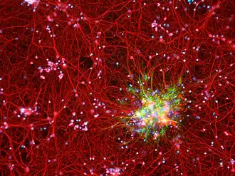 - Nervous system repair: Upon injury to nerve cells within the central nervous system, astrocytes fill up the space to form a glial scar, and may contribute to neural repair. The role of astrocytes in CNS regeneration following injury is not well understood though. The glial scar has traditionally been described as an impermeable barrier to regeneration, thus implicating a negative role in axon regeneration. However, recently, it was found through genetic ablation studies that astrocytes are actually required for regeneration to occur.[32] More importantly, the authors found that the astrocyte scar is actually essential for stimulated axons (that axons that have been coaxed to grow via neurotrophic supplementation) to extend through the injured spinal cord.[32] Astrocytes that have been pushed into a reactive phenotype (termed astrogliosis, defined by the upregulation of among others, GFAP and vimentin[33] expression, a definition still under debate) may actually be toxic to neurons, releasing signals that can kill neurons.[34] Much work, however, remains to elucidate their role in nervous system injury.